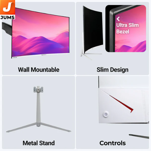 32″ (80 cm) curved Full HD (1920×1080) LED screen for immersive widescreen viewing. 75 Hz refresh rate delivers smoother motion than standard 60 Hz displays. Ultra‑slim bezel design for a clean, modern look and minimal distractions. Dynamic contrast ratio ~500,000:1 for deeper blacks and bright highlights. Max brightness ~250 nits for decent visibility in typical indoor lighting. Wide 178° horizontal/vertical viewing angles with support for 16.7 million colours for consistent colours from different angles.