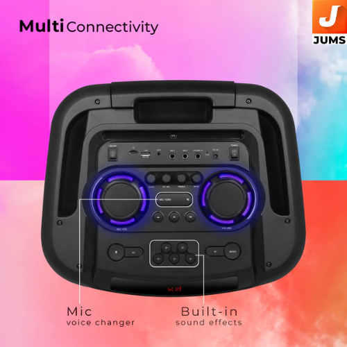 High-Power Output: Delivers 220 W RMS audio power for loud, dynamic sound well suited to parties and events. Wireless & Wired Playback: Bluetooth v5.0 streaming plus USB, microSD (mSD), and AUX inputs give versatile music options. TWS Support: True Wireless Stereo (TWS) lets you pair two speakers for a wider stereo soundstage. Live Performance Inputs: Includes 6.3 mm microphone input and guitar input for karaoke or connecting instruments.Karaoke Features: Comes with voice-changing wireless microphones for interactive singing and fun. Control & Display: RGB LED lights with a control switch and LED display add ambience and make status info easy to read. Sound Tuning Controls: On-board volume, bass, and treble controls let you tailor the sound to preference.