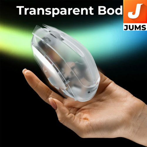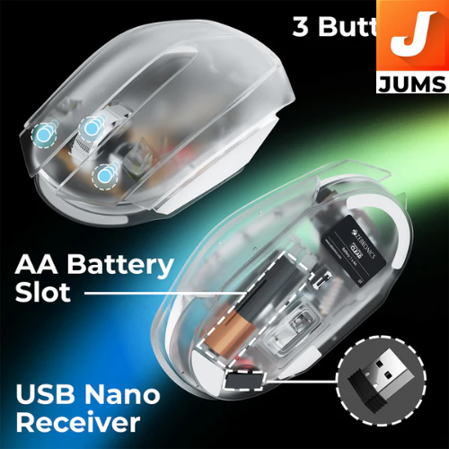 Product type: Wireless computer mouse by Zebronics. Connectivity: Uses a 2.4 GHz stable wireless connection with a USB nano receiver (plug‑and‑play). Design: Transparent body that gives it a unique look. Backlight: White LED backlight for an illuminated effect. Buttons: 3 buttons for standard mouse use. Resolution: 1200 DPI optical sensor for smooth tracking. Range: Wireless range up to ~10 m (without obstacles). Power: Runs on 1× AA battery; includes power & LED on/off switch to save battery. Surface support: Works on most surfaces, offering reliable performance. Ergonomics: Comfortable design suitable for daily computer tasks. Convenience: Receiver can be stored inside the mouse’s housing when not in use.