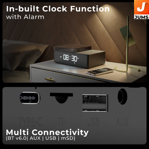Audio Output: 10 W RMS sound delivered via dual drivers with a passive radiator for balanced audio suitable for personal listening and small rooms. Bluetooth v6.0: Latest‑generation Bluetooth for stable wireless music streaming from phones and tablets. Multi‑Mode Playback: Supports USB, microSD (mSD), AUX, and FM radio so you can play music from drives, cards, or wired sources. TWS Function: True Wireless Stereo (TWS) allows connecting two speakers wirelessly for a wider stereo soundstage. RGB Lighting: 5 RGB light modes add visual ambience while music plays. Clock & Alarm: Built‑in 12 H/24 H clock with alarm function — useful as a bedside or desktop speaker.