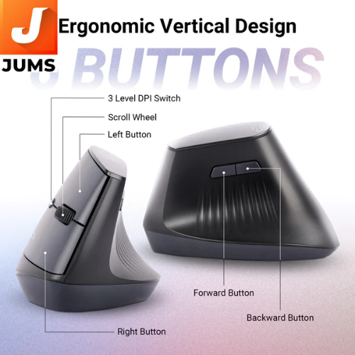 Dual‑mode wireless: Supports both 2.4 GHz RF (USB nano receiver) and Bluetooth for versatile connections to laptops, desktops, tablets, etc. Dual Bluetooth pairing: Lets you connect to two Bluetooth devices and switch between them easily.Up to 1600 DPI with 3‑level DPI switch (800 / 1200 / 1600) for adjustable pointer sensitivity. 6 buttons including left/right click, scroll wheel, DPI button, forward/back buttons for better control.Ergonomic vertical design helps promote a more natural hand posture, reducing wrist strain during extended use