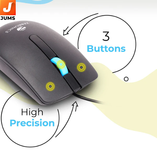 Zebronics Zeb‑Juggle Wired Mouse is a compact wired optical mouse from Zebronics designed for everyday computing. It connects via a USB plug‑and‑play interface with a 1.1 m cable and offers a 1200 DPI optical sensor for smooth and accurate cursor tracking. The mouse has 3 buttons (left click, right click, and scroll wheel) and an ergonomic design for comfortable use over extended sessions, performing reliably on most surfaces without requiring drivers. Its straightforward setup and precision make it a simple, affordable choice for tasks like browsing, office work, and general productivity.