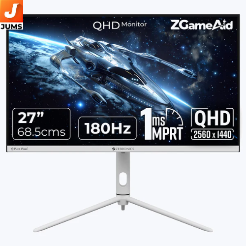 The ZEBRONICS N27C is a 27‑inch QHD (2560 × 1440) gaming monitor designed for immersive play, multimedia, and productivity. It features a high‑refresh‑rate 180 Hz IPS panel with 1 ms response time for smooth motion and responsiveness during fast action. The display delivers vibrant colours with wide coverage (~99 % sRGB and ~93 % DCI‑P3) and HDR10 support, along with a 300 nits brightness level and anti‑glare coating for comfortable viewing. Connectivity includes 2× HDMI, 2× DisplayPort, and a headphone jack, while built‑in speakers provide basic audio