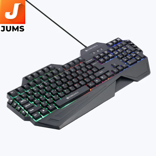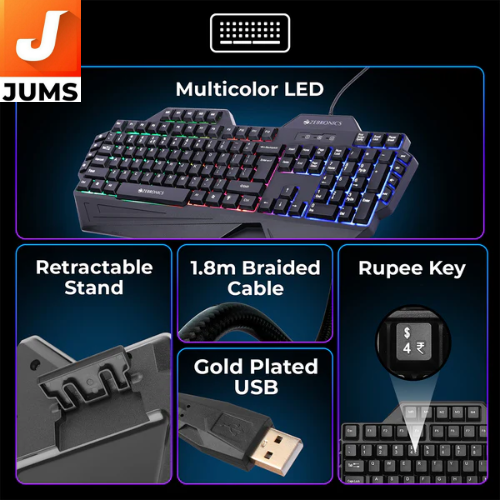 The Zebronics Optimus Gaming Keyboard & Mouse Combo is a wired gaming peripheral set that blends practical performance with stylish design for everyday computing and casual gaming. It includes a full-size keyboard with 117 keys, featuring dedicated multimedia and macro keys, multi-color LED backlighting with multiple light modes, a retractable stand, and braided cable with gold-plated USB for durability and stable connectivity
