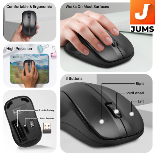 The Zebronics Zeb‑Pace Wireless Mouse is a budget‑friendly 2.4 GHz wireless optical mouse ideal for everyday computing tasks like browsing, office work, and basic laptop use. It uses a USB nano receiver for simple plug‑and‑play connectivity and offers high‑precision 1200 DPI tracking for smooth cursor control. The ergonomic and lightweight design makes it comfortable for extended use, and a power‑saving mode helps prolong battery life. With its reliable performance on most surfaces and straightforward three‑button layout, it’s a practical choice for users looking for a simple, dependable wireless mouse at an affordable price.
