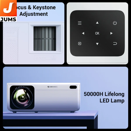 Zebronics PIXAPLAY 58 is a versatile smart LED projector built for home entertainment, offering crisp and vibrant visuals with a native Full HD (1920×1080) resolution and support for up to 4K content. It produces bright images with an LED lamp that lasts up to 50,000 hours and can project large screen sizes (up to around 533 cm / ~210 inches), making it ideal for movies, TV shows, sports, and gaming in a darkened room.