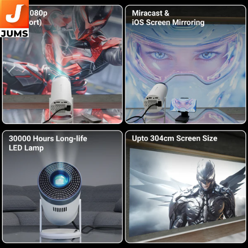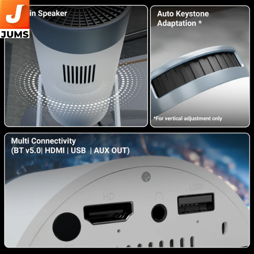 Smart Android Projector with Android 11 OS and app support. Built-in Speaker so you don’t need external speakers right away. Screen Mirroring: Supports Miracast and iOS screen mirroring for casting from phones/tablets. Dual-Band Wi-Fi (2.4GHz & 5GHz) and Bluetooth v5.0 for wireless connectivity. Auto Keystone Correction & 200° Tilt Mechanism to help align and adjust the projection easily.