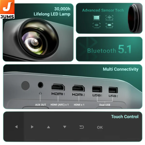 Home Theater Projectors for Movies, TV & Gaming etc.. Wide Compatibility Auto Focus Technology Auto Keystone Adaptation Auto Obstacle detection & Auto Screen Fit Remote Control Miracast IOS Screen mirroring Dual band Connectivity (2.4GHz & 5GHz) FHD 1080p (Native) APP Support Touch control