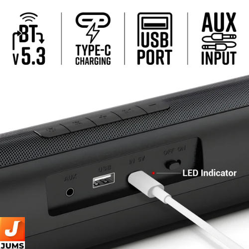 24 W RMS Output: Delivers 24 W (12 W + 12 W) of stereo sound through dual drivers, giving clear and dynamic audio performance. Bluetooth v5.3: Wireless connectivity for easy streaming from phones, tablets, and other Bluetooth devices. Multi‑Mode Playback: Supports USB playback and AUX input for wired audio sources. Multicolor LED Modes & LED Indicator: Built‑in multicolor LED lighting and status indicators enhance ambience and visual feedback during use. Dual Passive Radiators: Helps enhance bass and low‑end response for fuller audio output Rechargeable Battery: Offers up to ≈8 hours of playback on a full charge (at ~50 % volume with LEDs off). Type‑C Charging: Modern and convenient charging interface. Compact Portable Design: Slim mini‑soundbar form factor makes it suitable for tables, bedrooms, desktops, or TVs without taking up much space. On‑Unit Controls: Physical buttons for media and volume control make operation simple without needing your phone.