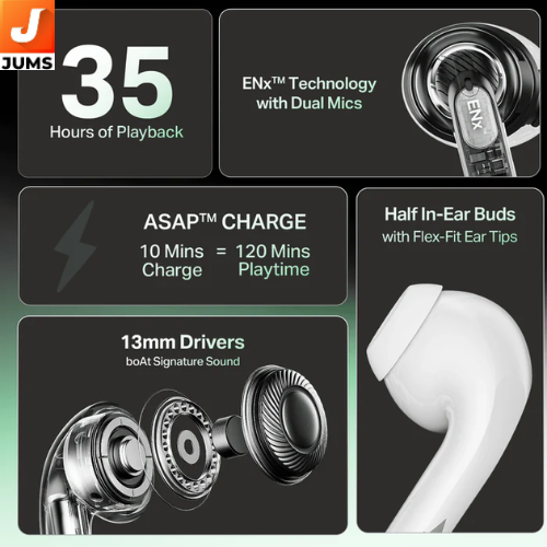 The boAt Airdopes 101v2 are an affordable and compact pair of truly wireless earbuds designed to deliver a quality listening experience. Powered by Bluetooth v5.0, these earbuds offer a stable and reliable connection for music and calls, ensuring minimal interruptions. The 10mm drivers produce boAt’s signature sound, providing deep bass and clear audio, making them ideal for casual music listeners and those who enjoy bass-heavy audio. The Airdopes 101v2 provide 3.5 hours of playtime on a single charge, and with the included charging case, you get a total of 14 hours of playback. The case charges via micro USB and takes about 1.5 hours to fully charge, ensuring that you’re always ready to go. With an IPX4 water and sweat resistance rating, these earbuds are durable enough to withstand sweat during workouts or light rain, making them suitable for outdoor activities.