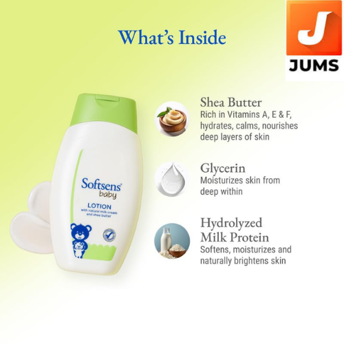 Softsens Baby Lotion moisturizes and cares for your baby's skin like never before. Enriched with Natural Milk Cream and Shea Butter, this Lotion provides gentle nourishment for your baby's delicate and sensitive skin. Now you can have more soft snuggles than ever before.